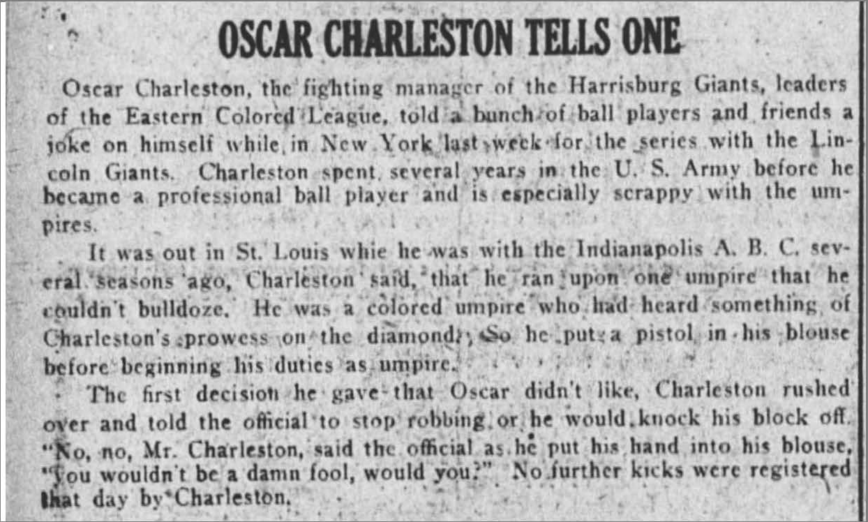 Oscar Charleston had a sense of humor, as this week’s clipping indicates. He evidently also knew that in his youth he had been too hotheaded.