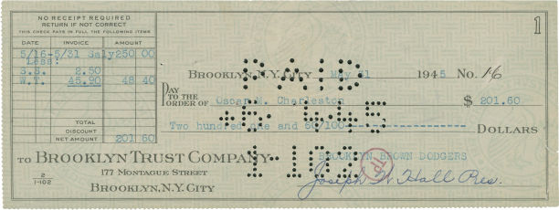 As this check shows, Oscar Charleston was paid $500 per month to manage the Brooklyn Brown Dodgers of the short-lived United States League in 1945. Usually referred to as the brainchild of the Brooklyn Dodgers’ Branch Rickey, the league had another moving force in former Pittsburgh Crawfords owner Gus Greenlee, for whom Charleston played in the 1930s.